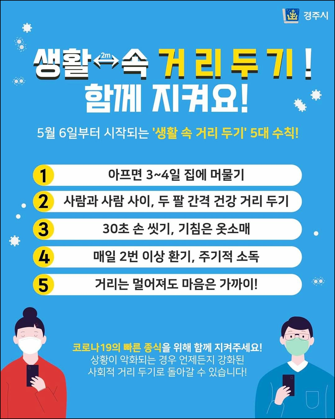 5월 6일부터 시작된 생활 속 거리두기는 지금까지 약 3개월 간 지속되고 있는데요. 많은 사람들의 협조와 도움이 요구되는 정책인 만큼 개인 방역에 만전을 기해 주시고 정부가 내리는 지침을 잘 지켜주셔서 개인의 건강과 가족의 건강을 함께 지켜나가 주시길 바랍니다.