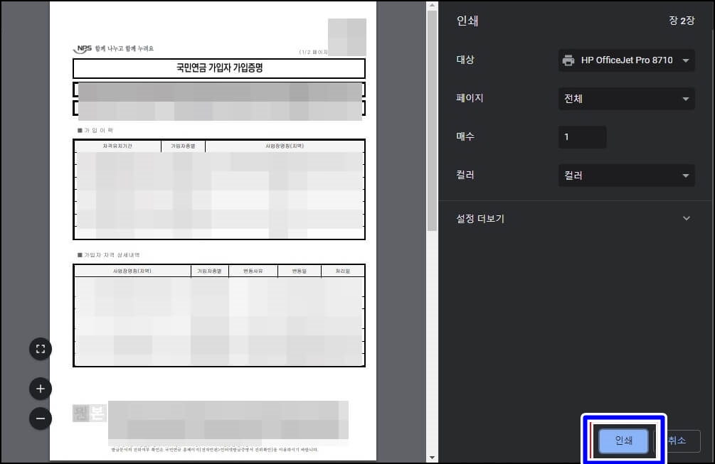 다음으로 프린터 발급을 클릭하면 문서 형식의 창이 뜨는데 인쇄를 하기 위해 좌측 상단에 프린터 이미지를 클릭합니다.