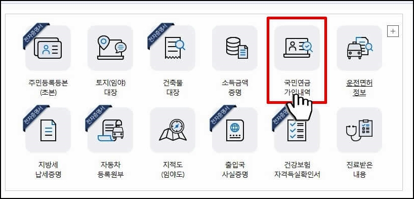 연금산정용 가입내역 확인서, 연금 지급내역 증명서, 일시금 지급내역 증명서, 소득공제용 납부확인서 조회, 퇴직금전환금 부과내역 조회, 개인회생신청용 확인서, 연금소득 원천징수 영수증,퇴직소득 원천징수 영수증,연금 수급증서 재발급 가입자(구 가입자) 증명서