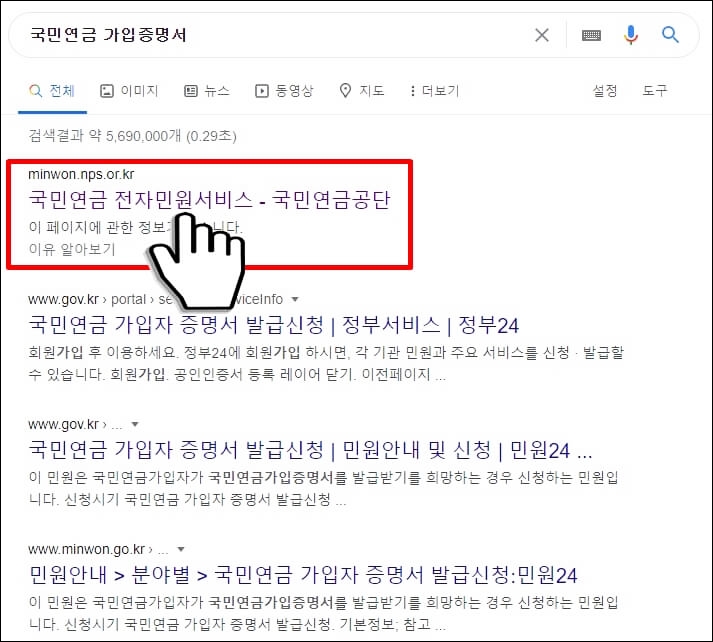 이번에는 증명서를 발급받기 위해서 국민연금 전자민원서비스로 가보겠습니다. 검색엔진에서 '국민연금 가입증명서'를 검색하시고 국민연금 전자민원서비스를 클릭합니다.