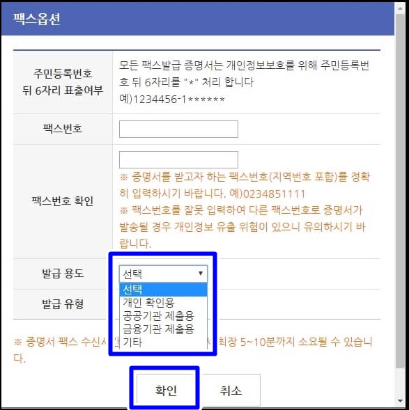팩스번호와 팩스번호 확인에 동일한 팩스번호를 입력하시고, 발급 용도를 선택합니다. 검증번호는 어느 기관에 제출하느냐에 따라 달라집니다. 회사에 제출할 용도로 쓰실 거면 개인 확용을 선택하시고 확인을 누르시면 해당 팩스번호로 공문서가 출력됩니다. 용