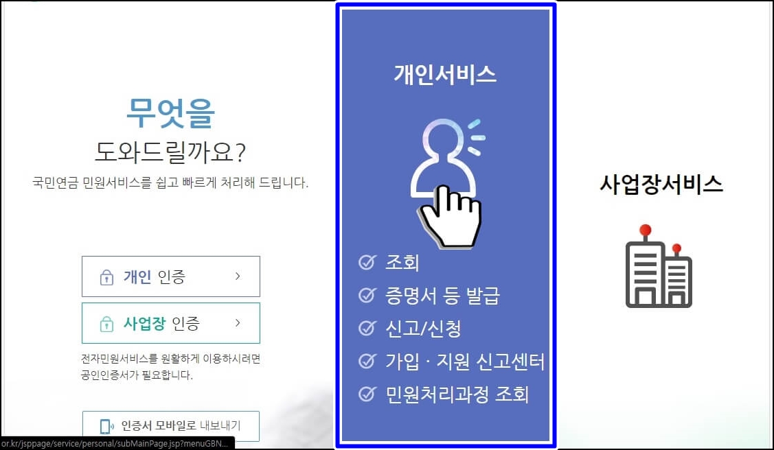 개인서비스와 사업장 서비스에서 필요한 서비스를 선택하시면 됩니다. 이번 포스팅에서는 개인서비스를 이용해보도록 하겠습니다.