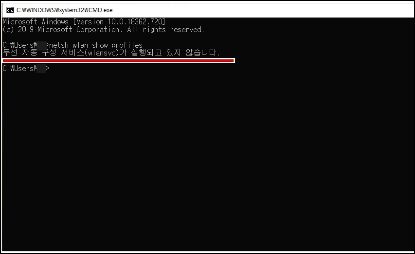 이것도 첫 번째 말씀드렸던 것과 마찬가지로 유선을 이용하시는 분들께는 해당 사항이 없으므로 패스해 주시면 되겠습니다. 모바일 앱을 통해서 무선이던, 유선이던 상관없이 비밀번호를 알 수 있기 때문에 이번 방법은 별로 필요는 없다고 생각되지만 그래도 알아두시면 좋을 것 같아서 알려드리겠습니다. 먼저 윈도우키+R를 동시에 누르면 실행창이 뜨는데요.. 여기에 CMD를 쳐서 CMD창으로 띄우시고 'netsh wlan show profiles'를 입력하신 다음 엔터를 누르면 아래 사진처럼 PC나 노트북이 유선으로 연결되신 분들은 무선 자동 구성 서비스가 실행되고 있지 않습니다.라는 문구가 나옵니다.