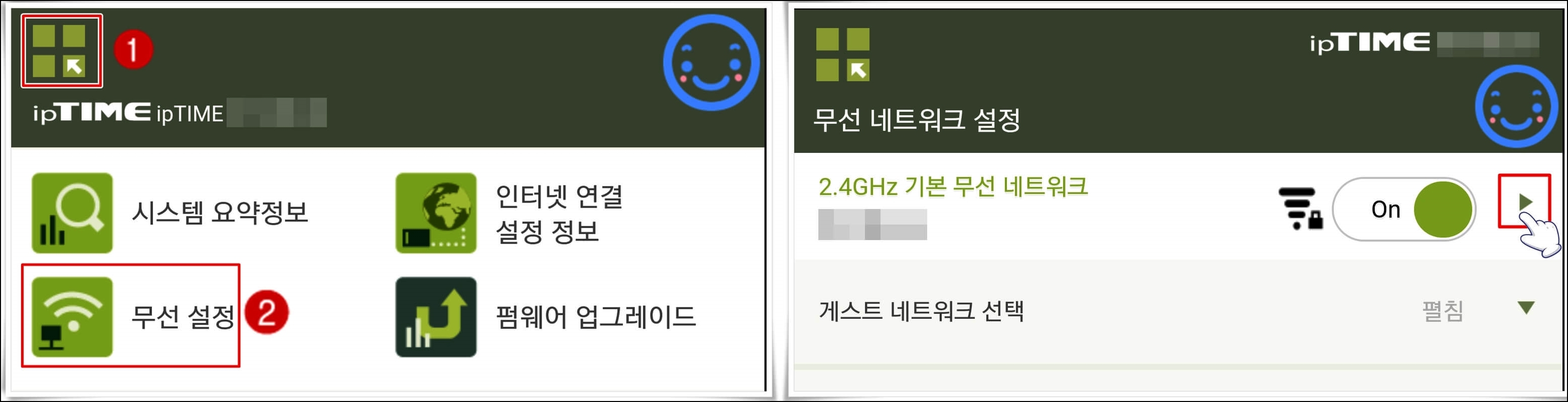또 하나의 방법은 아래 사진처럼 좌측 상단에 메뉴판을 터치하시고, 무선 설정으로 누르신 후에 다음 ▶ 화살표를 눌러봅니다.