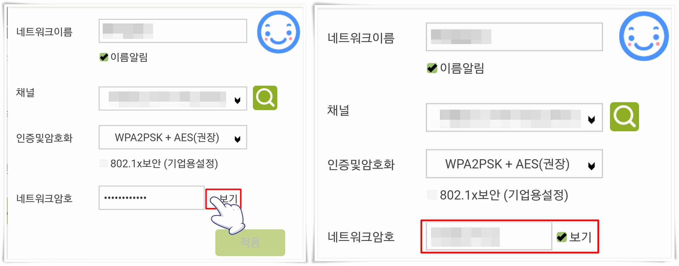 네트워크 암호 옆에 보기를 눌러보시면 비밀번호를 확인하실 수 있습니다.