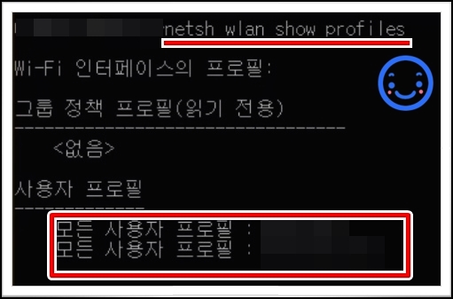 아래와 같이 무선인터넷을 사용하시는 경우에 'netsh wlan show profiles'를 입력하시면 사용자의 PC에서 확인되는 모든 무선 프로필을 노출시켜 줍니다.