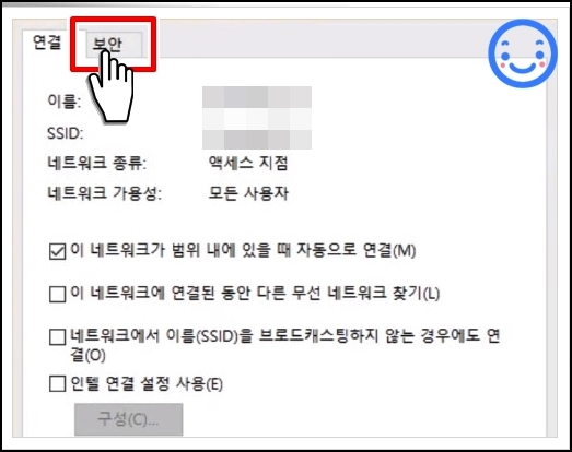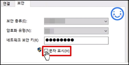 보안에 들어오셨으면 네트워크 보안 탭에서 자신이 쓰고 있는 와이파이 비밀번호를 확인하실 수 있습니다. 여기서 문자 표시(H)를 클릭하면 비밀번호가 표시됩니다.