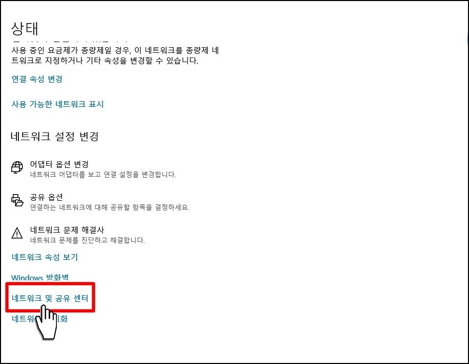 네트워크 및 공유 센터를 클릭합니다.