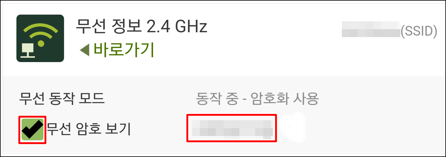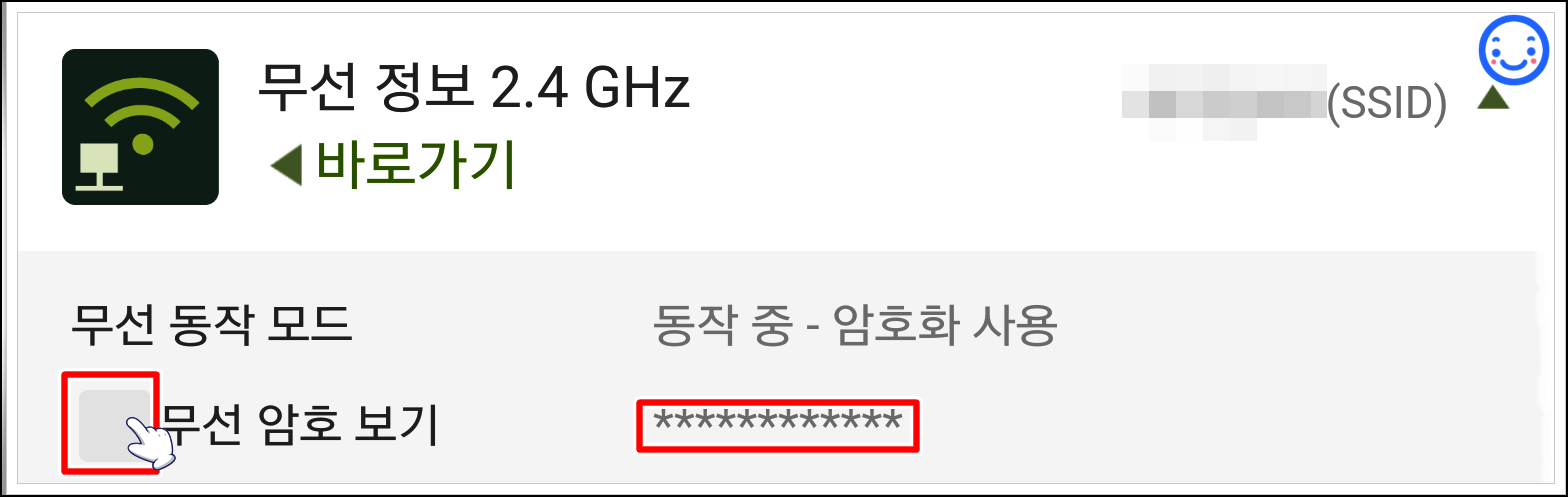 아래 그림처럼 무선 암호 보기를 터치하시면 비밀번호를 확인하실 수 있습니다.