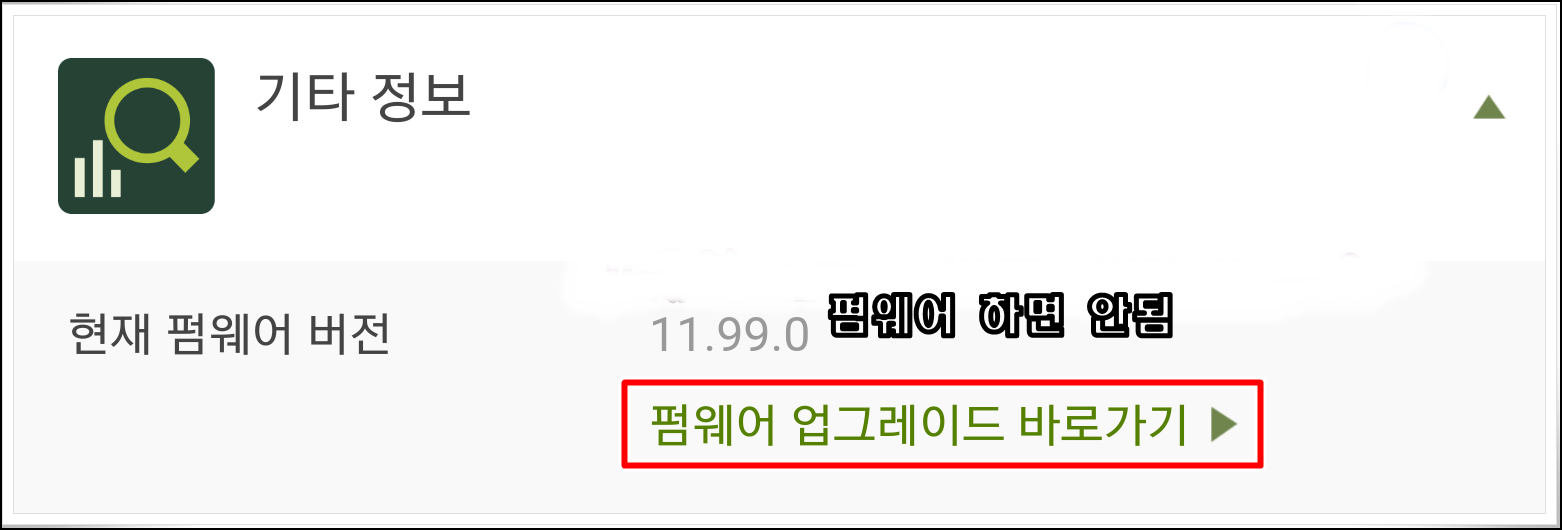주의하실 점은 기타 정보에 펌웨어 업그레이드가 있는데 이걸 하게 되면 공유기 검색이 안되게 돼있습니다. 만약에 실수로 펌웨어 업그레이드를 하셨다면 해당 스마트폰으로는 다시 설치하신다고 해도 안 되는데요.. 그럴 때는 집에 공기계가 있다면 새로 ipTIME manager를 설치하시고 진행하시면 됩니다. 플레이 스토어에도 펌웨어 업그레이드를 해서 검색이 안된다는 의견이 많이 있는 것으로 봐서는 ipTIME 측에서 이에 따른 조치를 취하지 않아서 생기는 문제인 듯합니다.