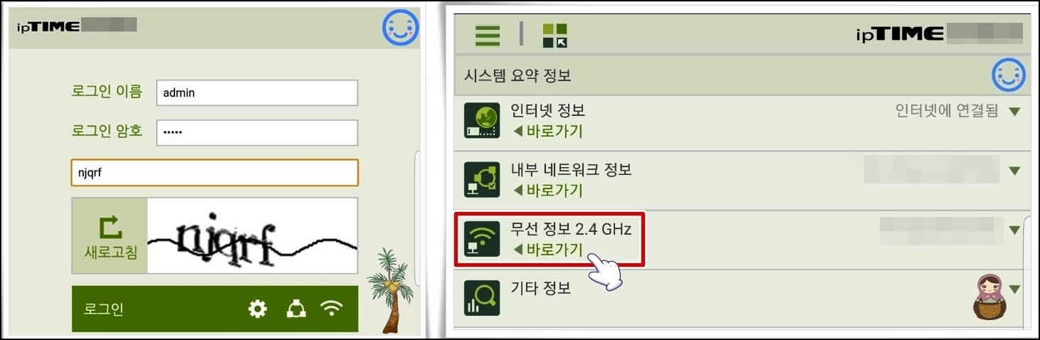 로그인 이름과 암호, 숫자를 입력하시고 로그인을 합니다. 기본으로 제공되는 이름과 암호는 둘 다 'admin'입니다. 비밀번호를 확인하는 방법은 2가지가 있는데요. 저는 외부 IP를 쓰고 있어서 그런지 무선 정보 바로가기를 눌러서 비밀번호를 확인할 수 있었습니다.