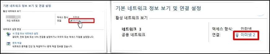 시작 전에 유선으로 연결하여 쓰는 분들은 해당되지 않는다고 설명드렸는데요... 좌측에 있는 것이 무선으로 연결했을 때나 오는 사진이고 우측이 있는 것이 유선으로 연결했을 때 나오는 사진입니다. 반드시 무선으로 연결했을 때만 가능합니다. 무선이시면 좌측에 연결을 클릭해봅니다.