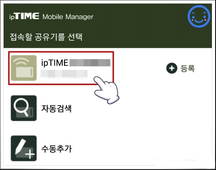 먼저 play 스토어에서 'IP TIME Mobile Manager'를 설치해봅니다. 설치한 앱을 접속하시면 자동으로 검색을 해서 자신이 쓰고 있는 공유기 모델명이 나옵니다 등록은 할 필요 없고 공유기 모델명을 눌러봅니다.