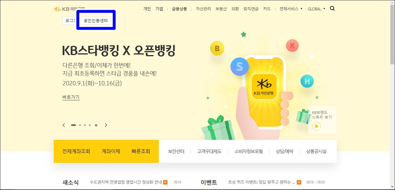검색엔진에서 국민은행을 입력하시고 해당 사이트로 접속하셔서 좌측 상단에 공인인증센터를 클릭합니다.