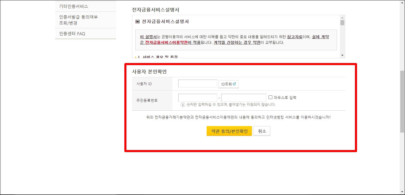 사용자 ID와 주민등록번호를 입력하신 다음 약관 동의/본인 확인을 클릭합니다.