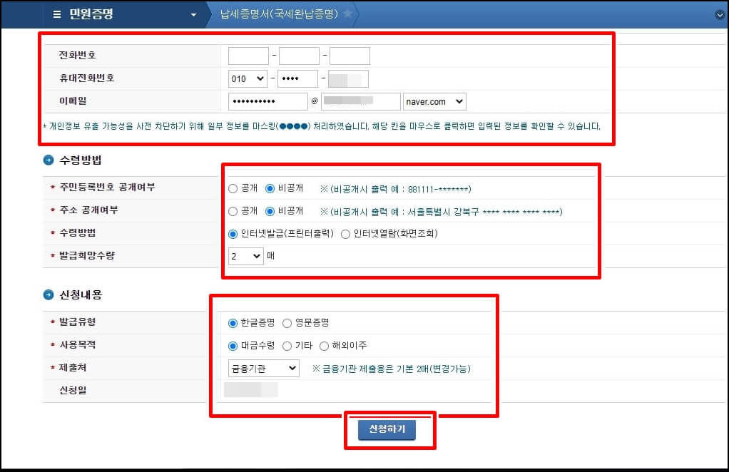기본적으로 수정하실 것은 없고 주민등록번호 공개 여부, 주소 공개 여부, 수령방법, 발급 희망수량, 제출처 등을 확인하시면 됩니다. 대출 문제로 금융기관에 제출하실 거면 사용목적에 기타로 체크해 주시면 되겠습니다. 체크가 끝나셨다면 신청하기를 클릭합니다.