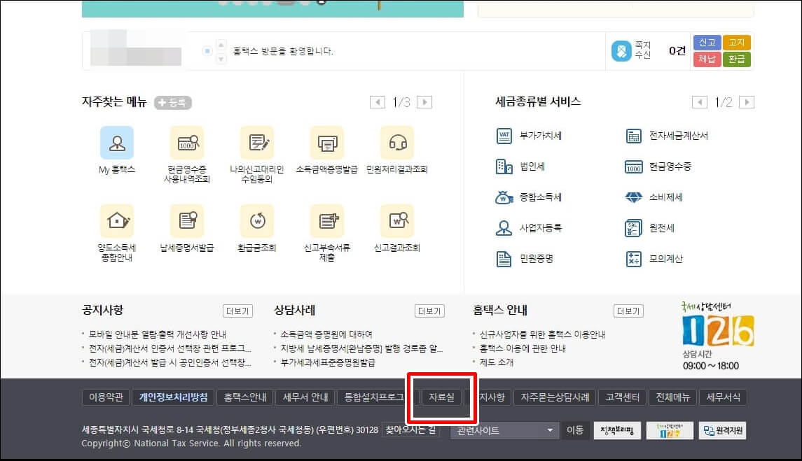 홈택스 사이트에서 아래로 스크롤하여 자료실을 클릭합니다.