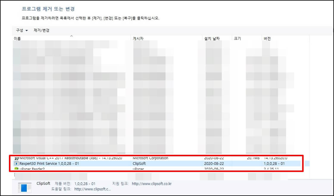 홈택스에서 삭제하라는 프로그램을 제어판에서 검색해봤더니 Rexpert30 Print Service 1,0,0,28 - 01이라는 프로그램이 설치되어 있었습니다. 정부에서 제공하는 공문서를 출력할 때는 워낙 설치되는 프로그램이 많다 보니 이것저것 깔면서 여러 가지 문제가 발생하는 것 같습니다. 해당 프로그램을 삭제하고 다시 한번 프린터 출력을 시도해보겠습니다.