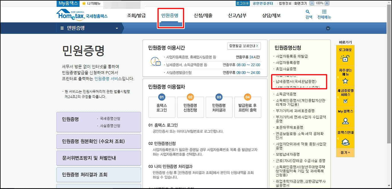 로그인이 되셨으면 민원증명 탭에서 납세증명서(국세 완납증명) 탭으로 이동해줍니다.