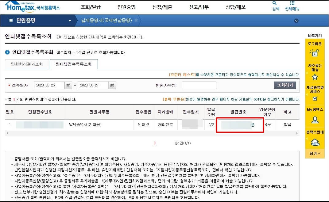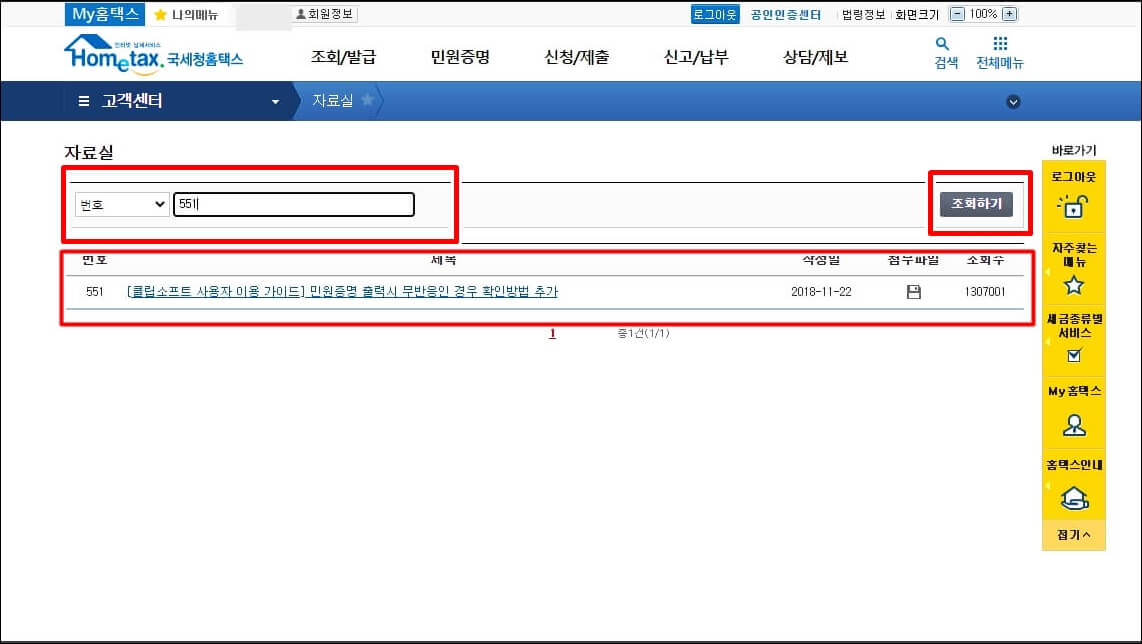 신청하기를 누르자 마자 처리가 완료되었습니다. 그리고 발급번호를 클릭하셔서 출력을 하시면 끝이 나는데요.. 다만 컴퓨터 환경에 따라서 출력 무반응 현상이 발생할 수가 있는데, 이런일이 많이 있다보니 홈택스에서 친절하게 안내를 해주고 있습니다. 저도 현재 출력 무반응 상태를 겪고 있는 중인데요... 홈택스에서는 출력 무반응 현상이 생길 때 자료실에서 들어가서 551번을 검색해서 참고하라는 안내를 해주고 있습니다. 그럼 안내하는대로 해보도록 하겠습니다.