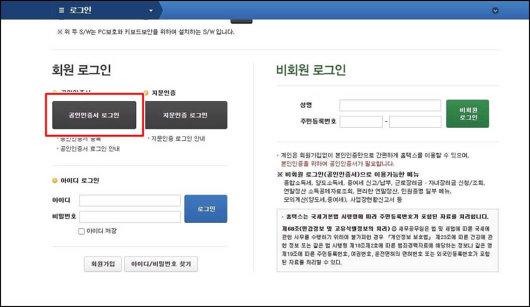 신청하기를 클릭해주시고 공인인증서로 로그인을 시도합니다.