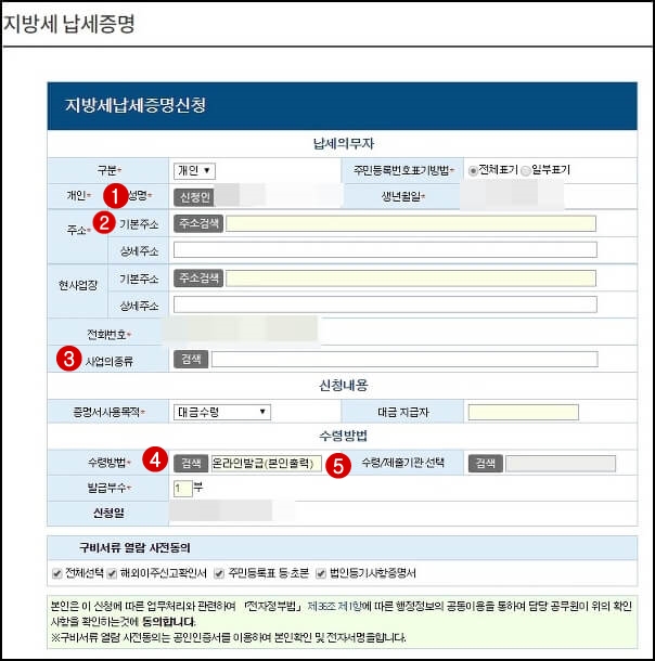 기본적으로 수정하실 것은 없고 주민등록번호 공개 여부, 주소 공개 여부, 수령방법, 발급 희망수량, 제출처 등을 확인하시면 됩니다. 대출 문제로 금융기관에 제출하실 거면 사용목적에 기타로 체크해 주시면 되겠습니다. 체크가 끝나셨다면 신청하기를 클릭합니다.