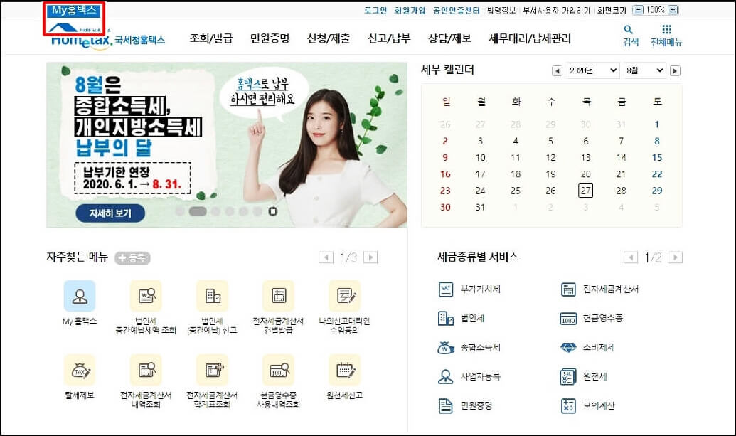 홈택스에서 지방세 납세증명서를 발급받으시려면 공인인증서가 필요한데요... 혹시라도 공인인증서가 없으신 분들은 포스팅 마지막에 공인인증서 발급받는 방법에 대한 포스팅 링크를 달아놓을 테니 참고해주시면 될 것 같습니다. 좌측 상단에 My 홈택스를 클릭합니다.