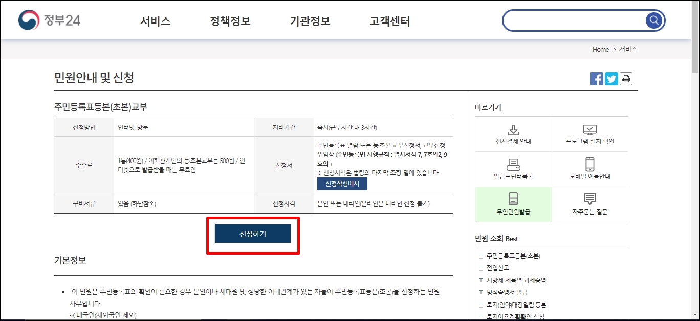 직장생활로 인해 발급받을 시간이 없는 분들을 위해서 전국에는 4,000대 이상의 무인발급기가 설치되어 있습니다. 무힌 발급기에서 주민등록등본을 발급받으려면 만 17세 이상만 가능하며 발급 시에는 주민등록증이 꼭 필요하며 수수료는 200원입니다.