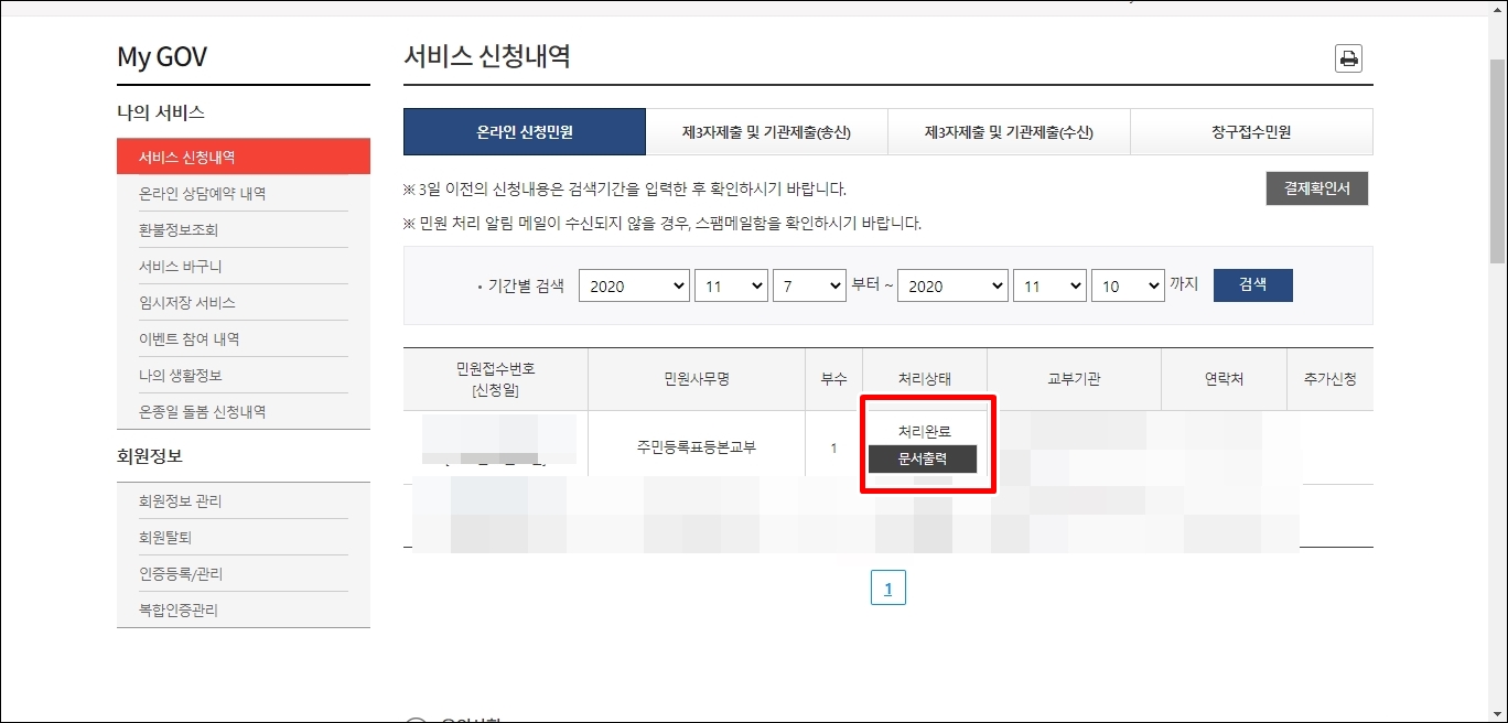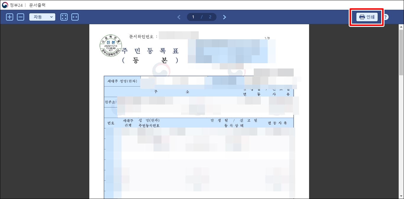 10초 만에 민원처리가 끝났습니다. 인쇄를 위해 [문서 출력]을 클릭합니다.