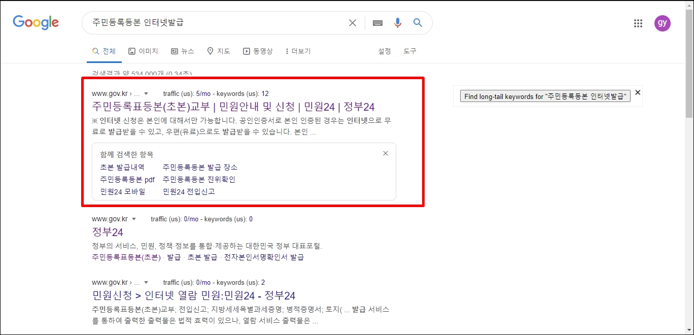 구글이나 기타 검색 엔진에서 주민등록등본 인터넷 발급을 검색하시고 정부 24 사이트로 접속을 시도합니다.