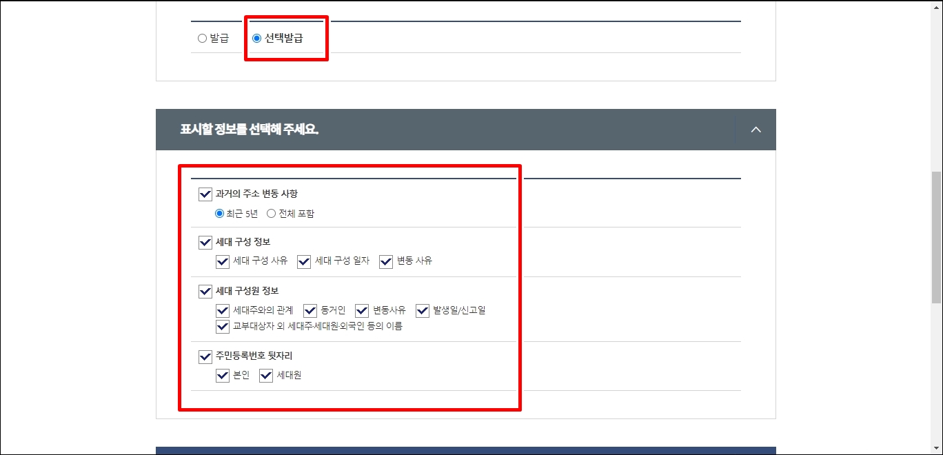 선택 발급을 선택하시면 등본에 표시될 정보들을 선택할 수 있습니다.