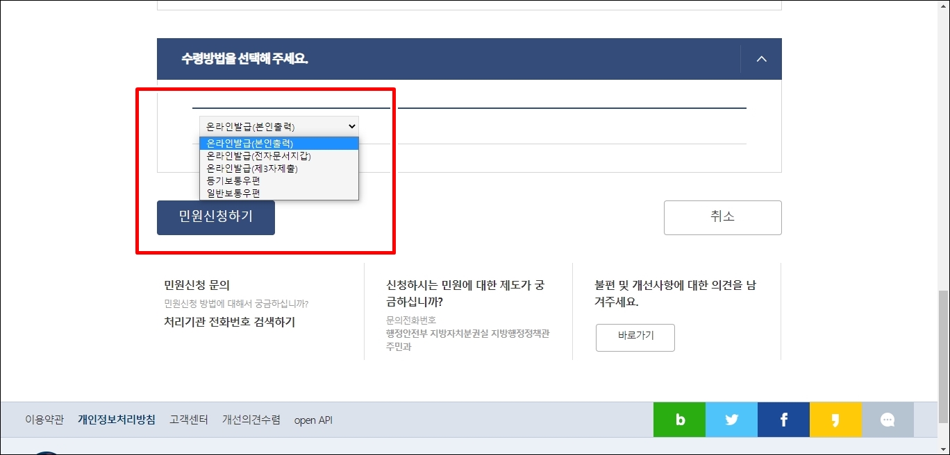 인터넷으로 빠르게 발급받으실 분들은 1번을 선택해 주시면 되겠습니다. 1번을 선택하시고 민원 신청하기를 클릭합니다.