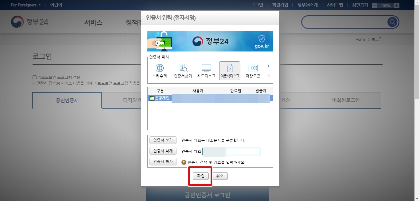 USB를 꽂아서 인증서 암호를 입력하신 후 확인을 클릭합니다.