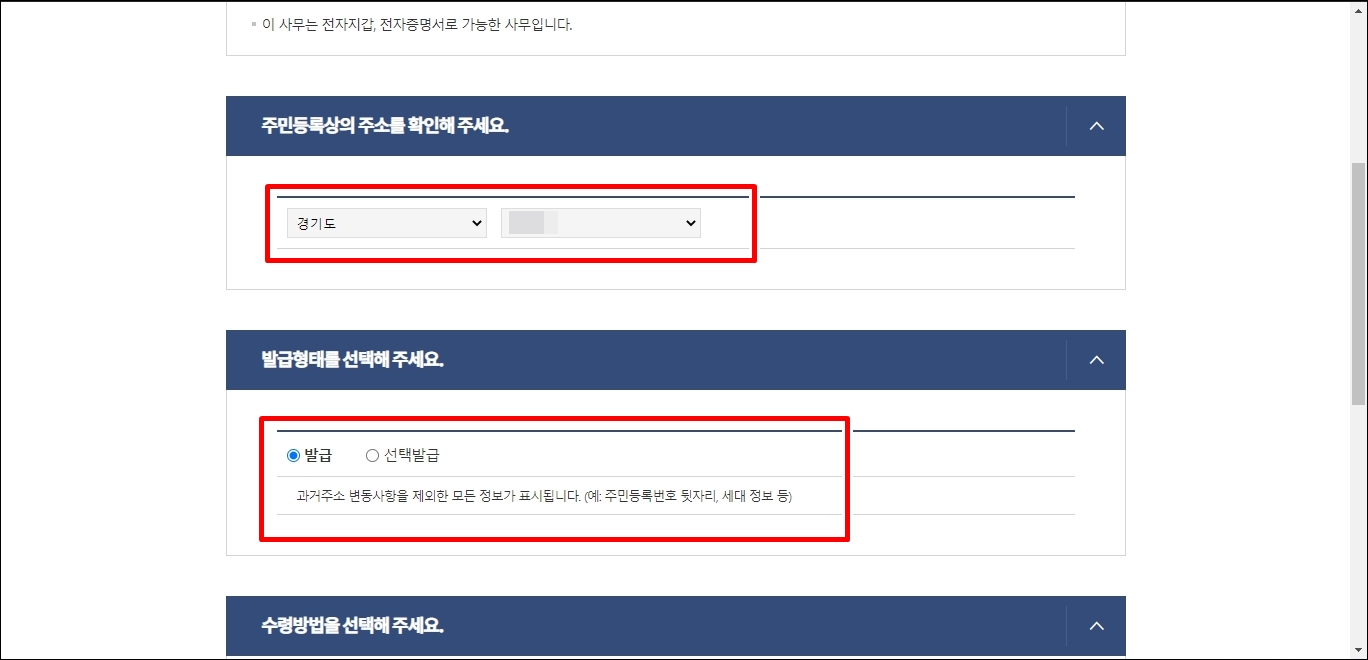 주민등록상의 주소와 선택된 행정구역이 맞는지 확인하시고 발급 형태를 선택합니다. 발급 형태는 발급과 선택 발급으로 나뉘는데 발급을 선택하시면 이사하면서 생겼던 변동사항을 제외한 모든 정보가 표시됩니다.