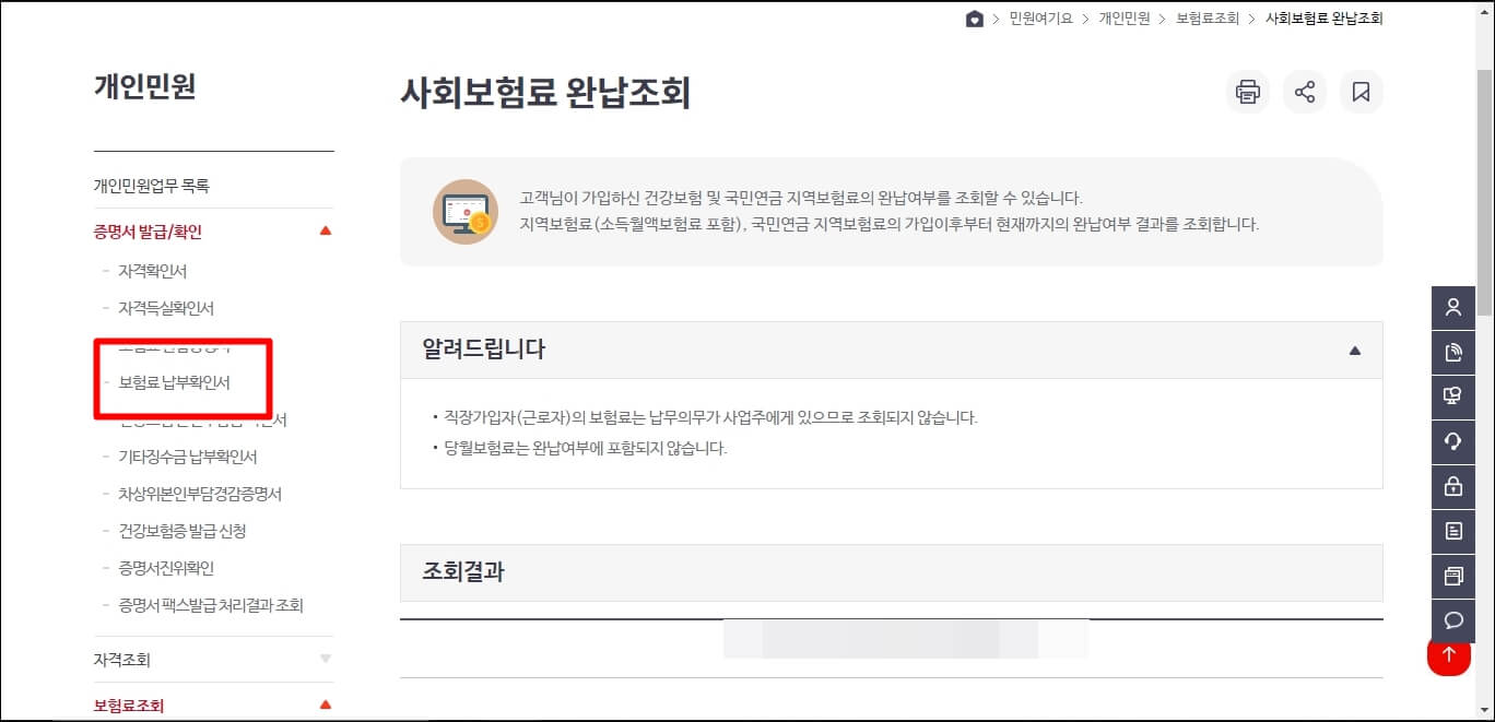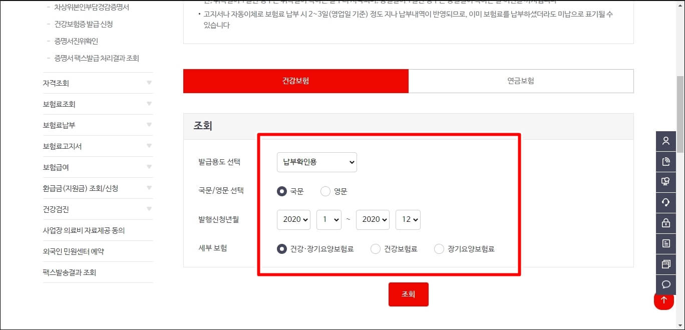 여기서 증명서 발급/확인 탭을 클릭하시고 보험료 납부확인서를 클릭합니다.
