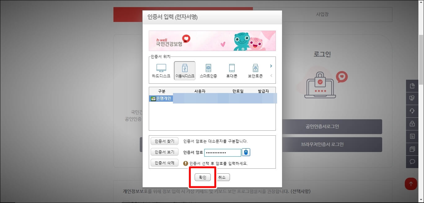 공인인증서의 암호를 입력하시고 확인을 클릭합니다.