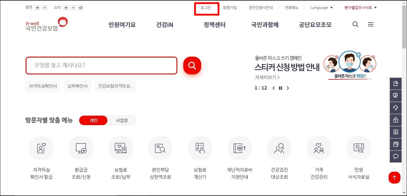 국민 건강 보험 사이트에 접속하신 다음 로그인을 클릭합니다.
