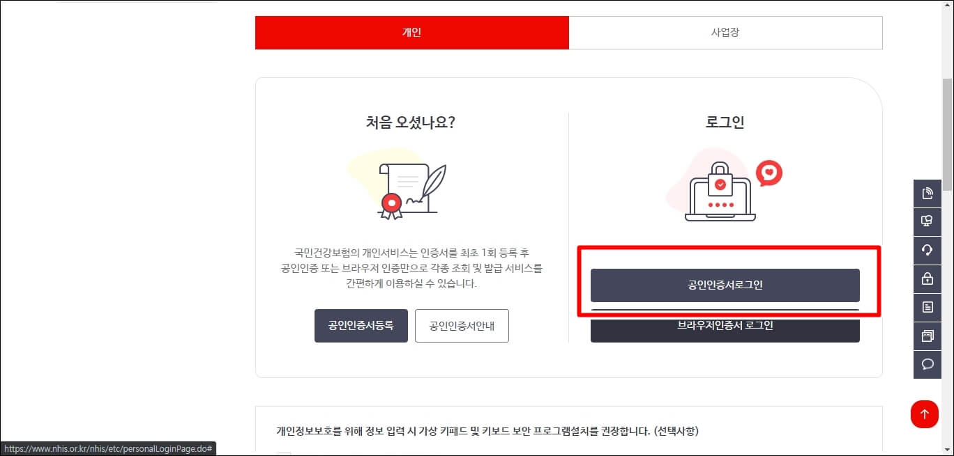 공인인증서 로그인을 클릭합니다.