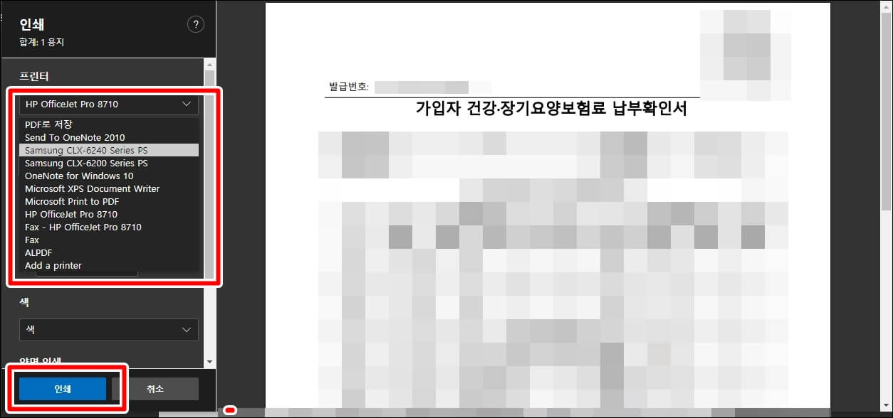 여기서 PDF로 저장하시거나 컴퓨터에 연결된 프린터기를 선택하시고 좌측 하단에 인쇄를 누르시면 납부 확인서가 출력이 됩니다.