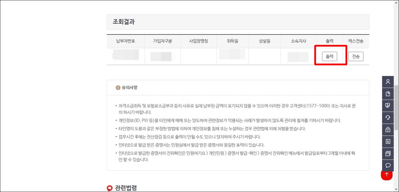 출력을 하기 전에 발급 용도 선택, 국문/영문 선택, 발행신청 년월, 세부 보험 등의 옵션을 선택합니다. 특별히 발급 용도는 정확하게 선택을 하셔야 합니다.