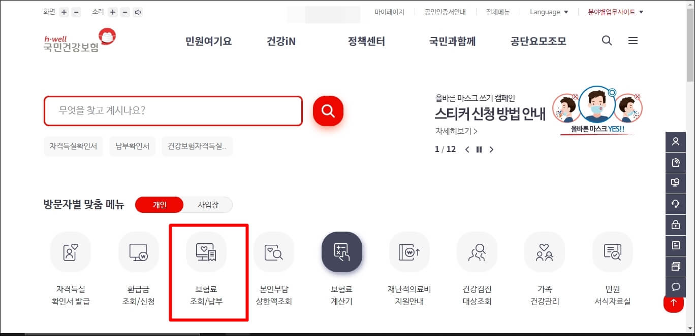 보험료 조회/납부 탭을 클릭합니다.