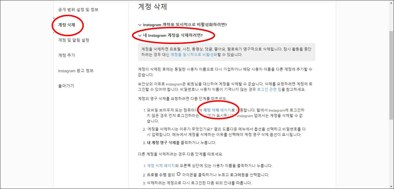 계정 삭제를 클릭하시고 내 instagram 계정을 삭제하려면?을 클릭하시면 계정 삭제 페이지 링크가 나오는데요.. 이 링크를 클릭해줍니다.