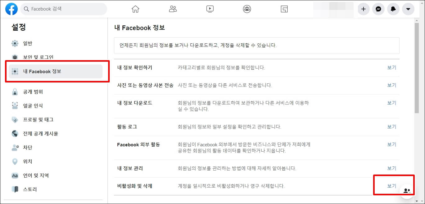 좌측 중간에 [내 Facebook 정보]를 클릭하시고 하단 [비활성화 및 삭제] 탭에 있는 [보기]를 클릭합니다. 보통 사람들은 페이스북 탈퇴를 하실 때 [보안 및 로그인]에서 많이 찾으시는데요. 헷갈리지 않으시길 바랍니다.