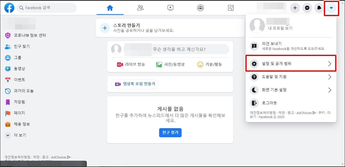 우측 최상단에 메뉴판을 클릭하시고 [설정 및 공개 범위]를 클릭합니다.