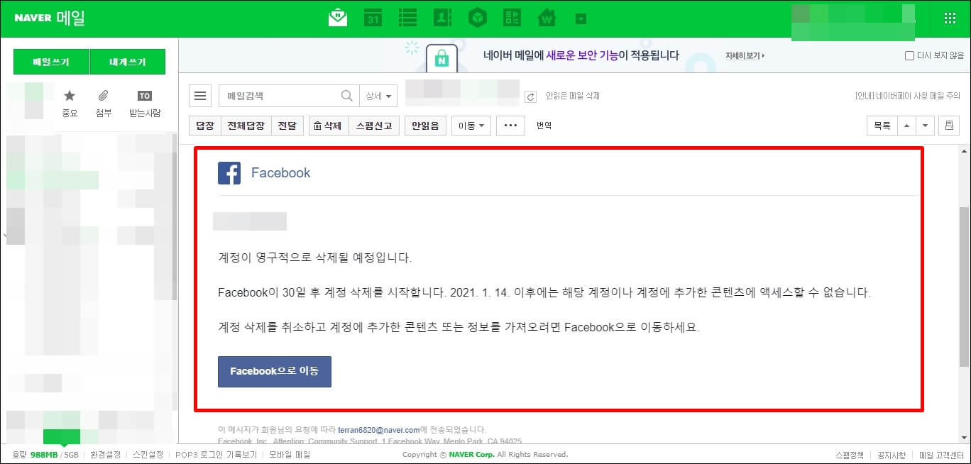 제가 사용했던 이메일에도 아래와 같이 페이스북 탈퇴 정보에 대한 안내 메일이 와있습니다. 탈퇴 시점이 2020년 12월 15일이니 최종 탈퇴 처리는 2021.1.14일 날 처리가 되겠네요.