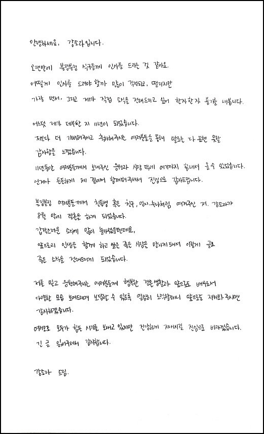 17일 강소라는 자신의 팬카페에 자필로 편지를 써서 올렸다고 합니다...자필 편지에서 강소라는 친동생 혹은 친구, 언니, 누나처럼 여겨주신 저, 강소라가 8월 말에 결혼을 하게 됐습니다는 기분 좋은 소식을 전했습니다. 그리고 뒤이어 배우로서 다양한 모습을 보여드리며 팬 여러분들의 사랑에 보답하겠다며 앞으로도 잘 지켜봐 달라는 내용을 담았습니다.