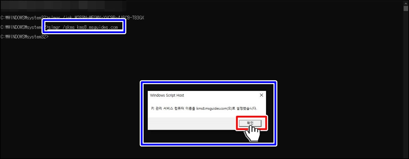그다음으로는 slmgr /skms kms8.msguides.com 문자를 입력하시고 엔터를 누르시면 키 관리 서버 설정이 됐다는 문구가 나옵니다.