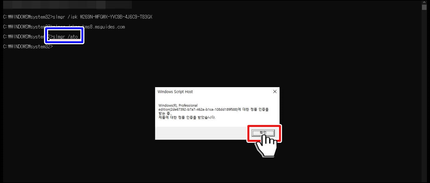 다음으로 slmgr /ato 입력하시고 엔터를 누르시면 현재 연결된 서버에서 정품인증을 받게 되므로 여기까지 오셨다면 정품인증이 끝나신 것입니다.
