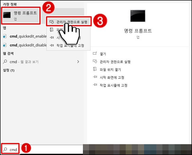 윈도우 좌측 하단 검색창에 'cmd'를 입력하시고 명령 프롬프트를 우클릭하신 후 '관리자 권한으로 실행'을 클릭하여 CMD에 접속합니다.