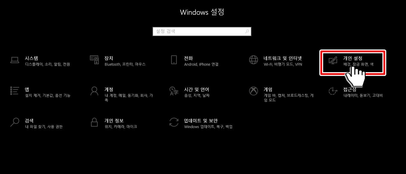 윈도우키+i키를 동시에 눌러서 windows 설정에 들어간 다음 개인 설정으로 들어갑니다.